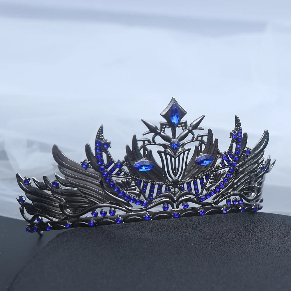 Wrought in silvered alloy and veined with sapphire glass, the Seraphine Crown is a masterpiece of gothic artistry — a relic seemingly lifted from a forgotten court of angels and shadows. Its sculpted wings rise in sweeping arcs, framing the wearer’s visage with both grace and power. Whether worn at ceremony, revel, or masquerade, it commands reverence as much as awe.